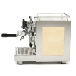 The Black version of the Bezzera Aria includes rosewood accented steam, hot water, and E61 lever knobs as well as rosewood handle portafilters.