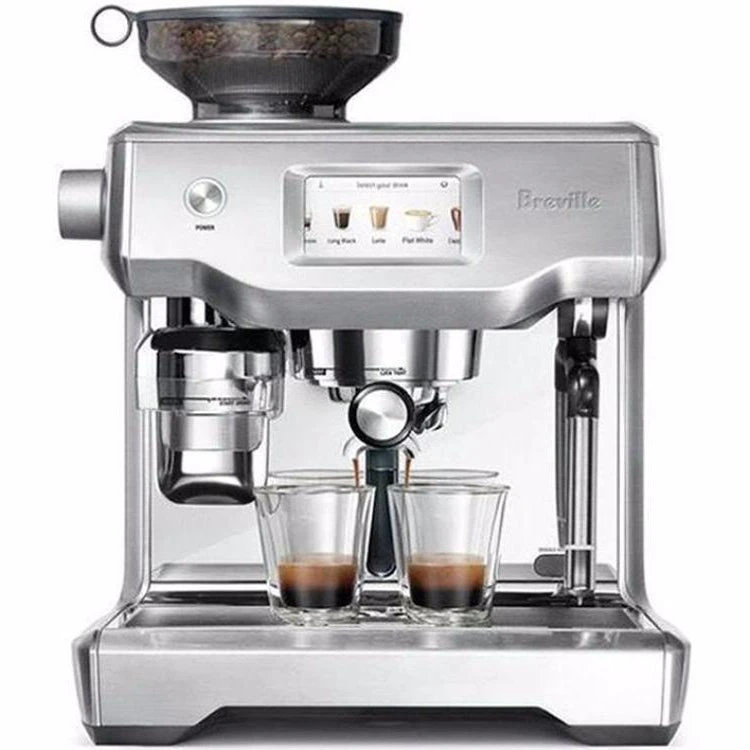 The Breville Oracle Touch BES990BSS breaks new ground as a bridge between manual and automatic espresso machines. As an update to the Oracle, the Oracle Touch boasts a vibrant touch display, allowing you to scroll through 5 customizable drink options: espresso, long black, latte, flat white, and cappuccino. Just as well, you can save up to 8 personalized drinks; especially useful when there are multiple users with differing tastes. The Oracle Touch has automatic grinding, dosing, tamping and milk texturing, automating the two most difficult parts of manual espresso. You can extract espresso and texture milk simultaneously, enabling you to go from beans to latte in under a minute. This dual boiler espresso machine features a triple heat system comprised of a steam boiler with an integrated heat-exchange and dedicated brew boiler, a built-in grinder and tamping system, programmable shot volumes, automatic rinsing and descaling options, milk frothing controls, PID temperature control, adjustable grind settings, and more. With the Oracle Touch you get nothing less than an all-in-one home espresso solution that combines innovative features with modern technology.