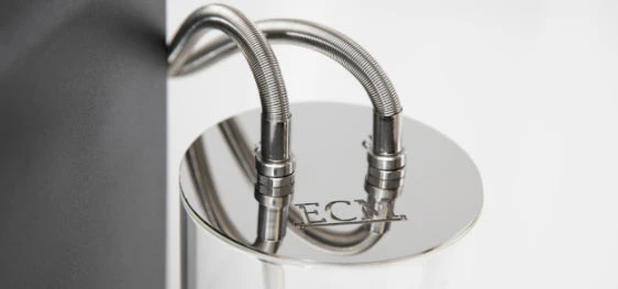 Until you see it in person, it’s hard to overstate just how compact the Puristika is. At just 7.7” W x 13.7” D x 12.4” H, it edges out the Casa V as ECM’s single smallest espresso machine. That said, this was achieved by separating the 2 liter reservoir into a standalone component that connects to the back of the machine. The 4.75” diameter reservoir plumbs in with braided steel hoses and is made from beautiful crystal clear glass.