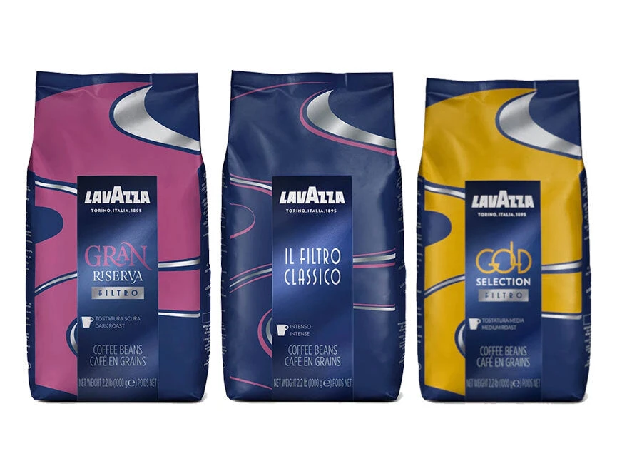 Blended and roasted by Lavazza for preparation in traditional American coffee makers, the Filtro series of coffees is the Italian take on a classic cup of coffee. Collecting three of their most popular filter coffees, this sampler includes a bag each of their Il Filtro Classico, Gran Riserva Filtro, and Gold Selection Filtro coffees. Il Filtro Classico is an intense dark roast with a high ratio of Robusta to Arabica, while Riserva and Gold Selection are smoother 100% Arabica blends: