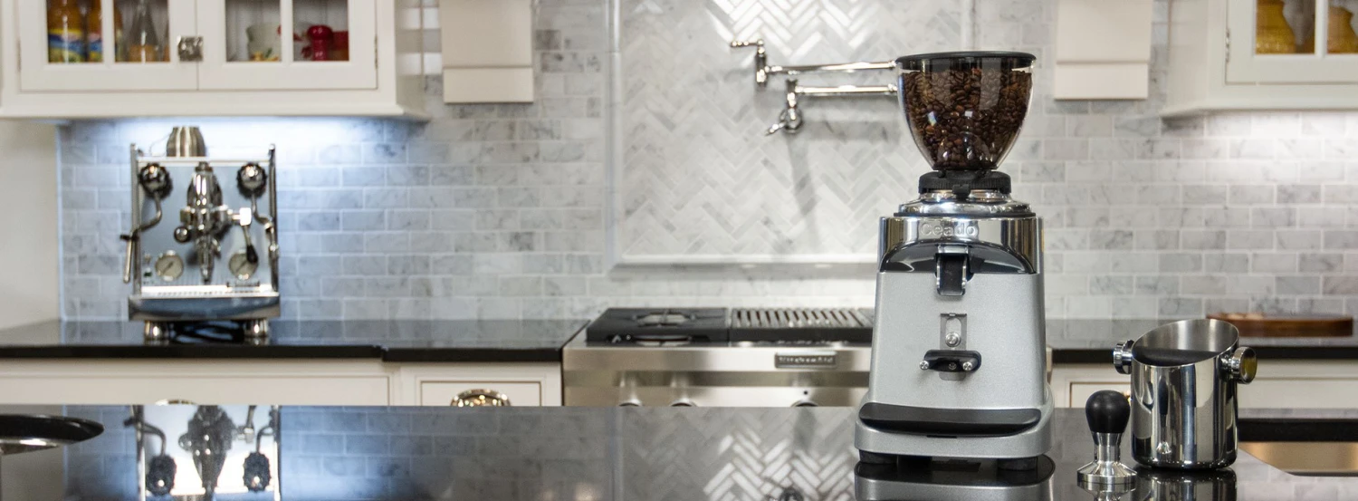 The smallest offering in Ceado’s E37 series, the E37J rounds out the line with its compact stature, without losing the great features expected of the E37 grinders. This doserless grinder is stepless, for infinite grind adjustment when you push or pull the lever on the collar. Inside, a super quiet 300 watt motor is mechanically suspended on rubber mounts. With its powerful motor and 64mm burrs, grinds are dispensed at a rate of 1.7 grams per second. This is a great rule of thumb to keep in mind when programming single and double shot doses, which you can later press to dispense a perfectly timed shot on-demand. Grounds are kept clump free by a little flap integrated into the coffee chute, which is very effective at breaking them up so that grounds dispense evenly into the middle of your portafilter each time you grind. Manual grinding is easily done by pressing the portafilter into the grind button and holding it until the desired amount of grounds is reached. For hands free grinding, the E37J will hold on to your portafilter while grinding so you don’t have to. The J lives up to the hype of the rest of the line, and it’s perfect for a home setting.
