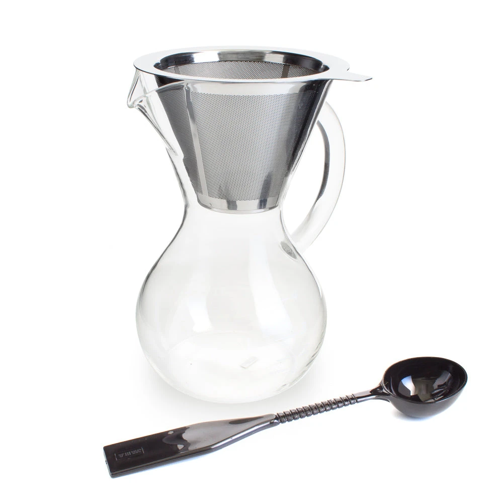 Yama’s Hermiston Dripper Pot is designed to be both functional and affordable. Made from hand blown borosilicate glass, the Hermiston is unique among pour over brewers, using a stainless steel filter as opposed to cloth or paper. A metal filter means that not only will you be able to brew with it an nigh-infinite number of times, but that will also be very easy to clean. The Hermiston holds up to 20 oz of liquid and features an easy pouring spout and handle making it ideal for serving guests. The pot also comes with a dual purpose coffee scoop and stirrer for easy measurement and for agitating the grounds while brewing. Conveniently, the Hermiston Dripper Pot is both dishwasher and microwave safe.